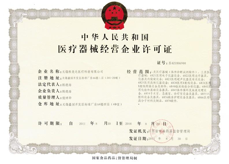 無錫科美達(dá)醫(yī)療器械有限公司于2011年8月順利取得中華人民共和國醫(yī)療器械企業(yè)經(jīng)營許證。