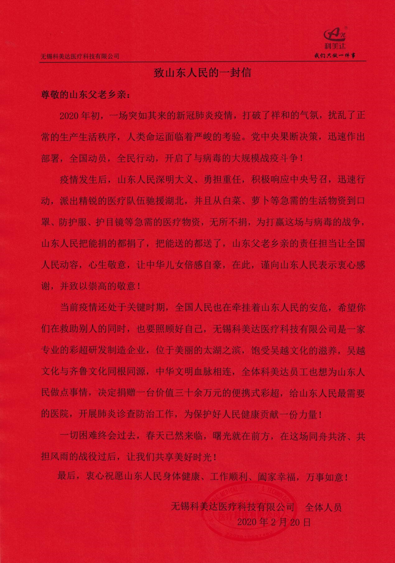 庚子年初,新冠肺炎疫情洶涌而來(lái),隨著鐘南山院士馳援武漢指出新冠肺炎存在“人傳人”的現(xiàn)象,一場(chǎng)史無(wú)前例的疫情攻堅(jiān)戰(zhàn)在全國(guó)打響。武漢告急,全國(guó)馳援,從生活物資到醫(yī)療用品源源不斷往最需要的地方,山東人民搬家式的支援抗疫模式更是感動(dòng)了全國(guó)人民,彩超作為新冠肺炎病情診斷的重要手段,得到臨床專家的重視,為緩解疫情防控期間醫(yī)療物資緊缺狀況,有效防范醫(yī)護(hù)人員感染和疫情擴(kuò)散風(fēng)險(xiǎn),科美達(dá)公司主動(dòng)聯(lián)系山東省慈善機(jī)構(gòu),向濟(jì)南市鋼城區(qū)慈善總會(huì)定向捐贈(zèng)了價(jià)值38萬(wàn)元的便攜式彩超設(shè)備,用于濟(jì)南市鋼城區(qū)醫(yī)院抗擊肺炎疫情和人民健康檢查,確保戰(zhàn)略后方穩(wěn)固。